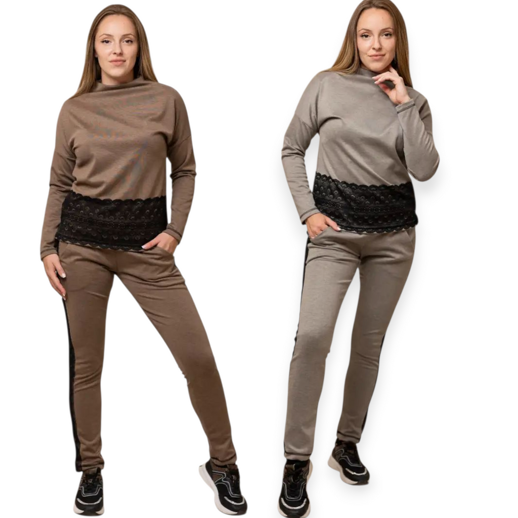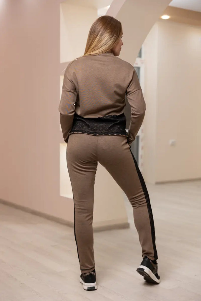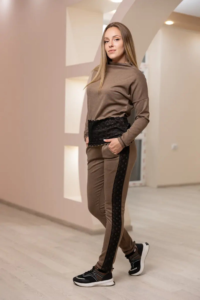 Черна дантела в долната част на блузата и по страничния шев на панталона