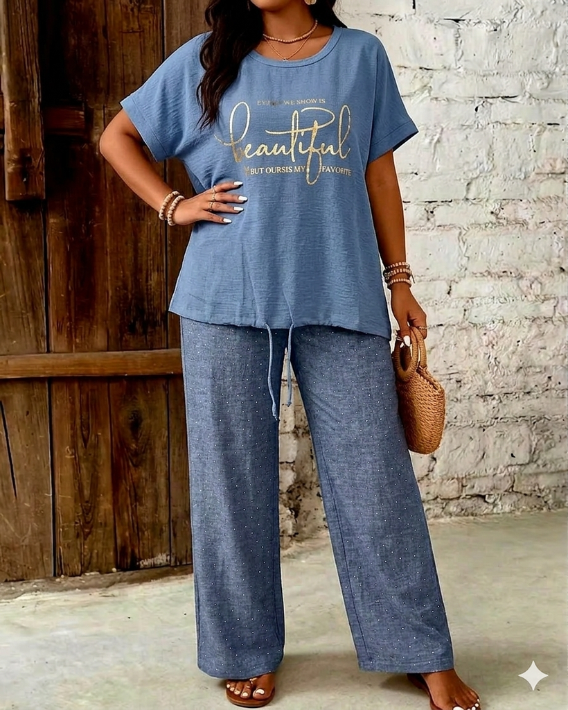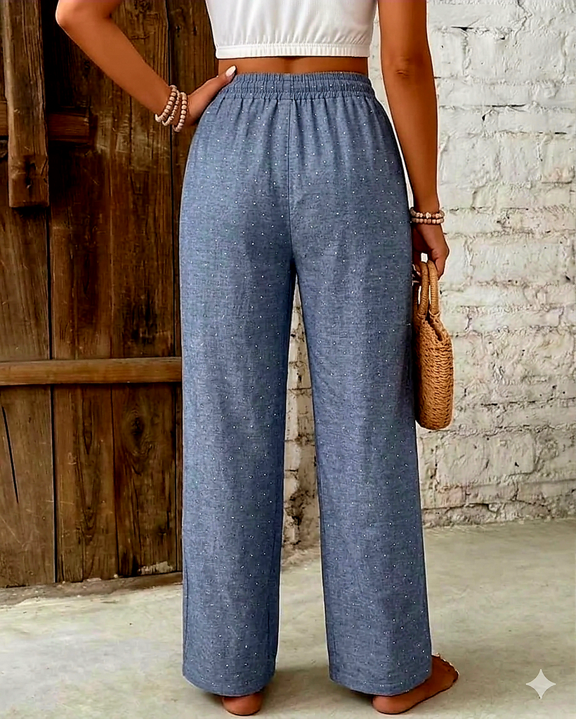 С Връзки и широк ластик в талията, свободен/широк крачол надолу. Наличие на ситни камъчета на плата.